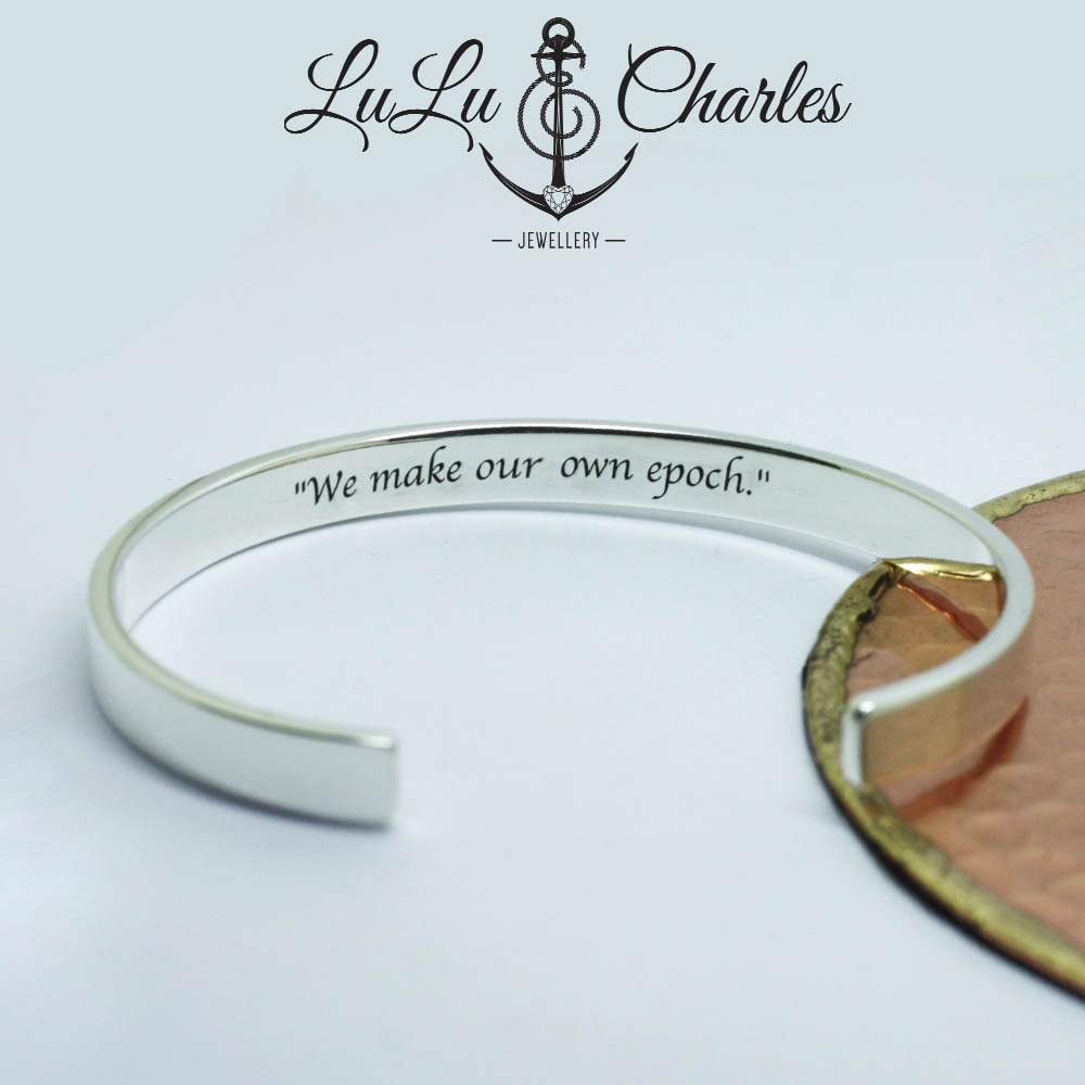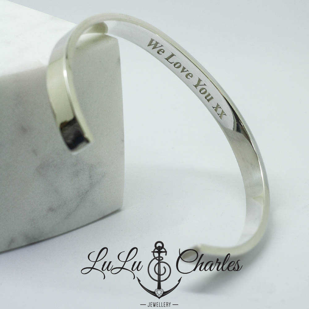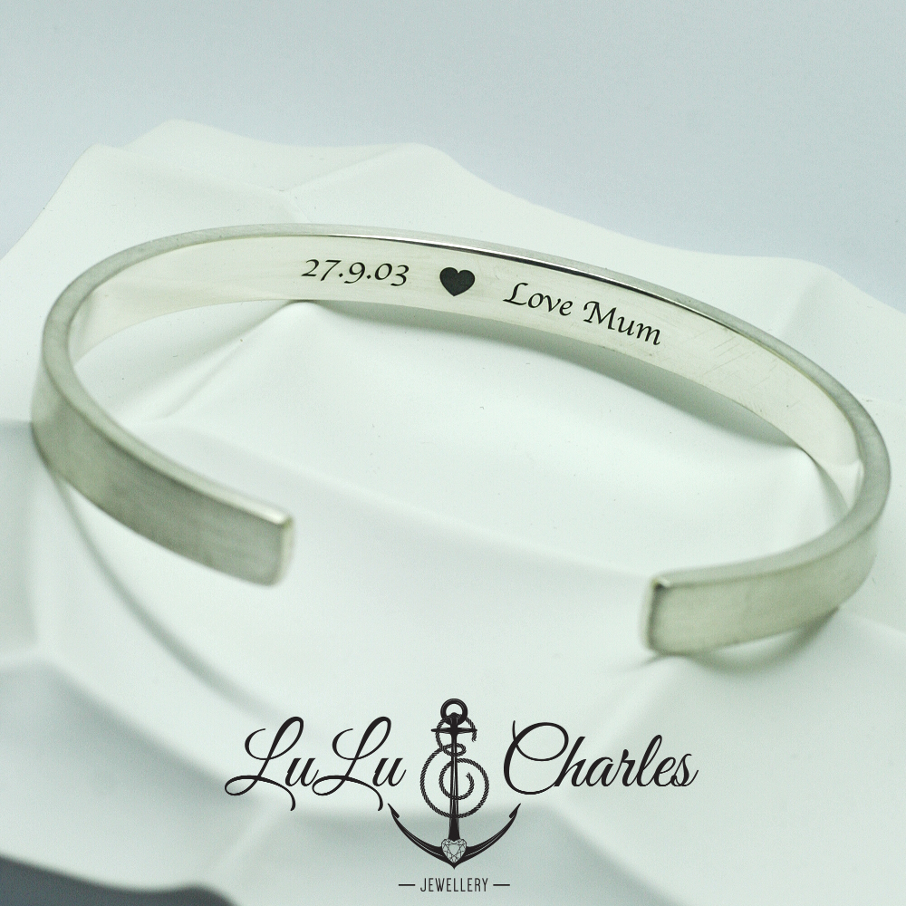 Our men’s handmade sterling silver cuff bangle measures approximately 7mm’s wide by 2mm thick, to suit the average wrist size and can be personalised with a message of your choice, inside or out.